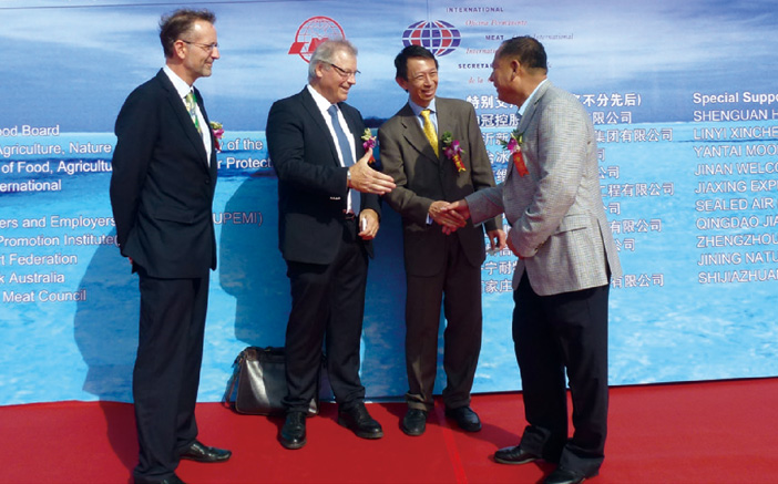 2013年10月13日,第十一屆中國(青島)國際肉類工業(yè)展覽會(huì)上,大莊園集團(tuán)董事長陳希濱與世界肉類組織主席阿圖羅·拉瓦洛友好交談。