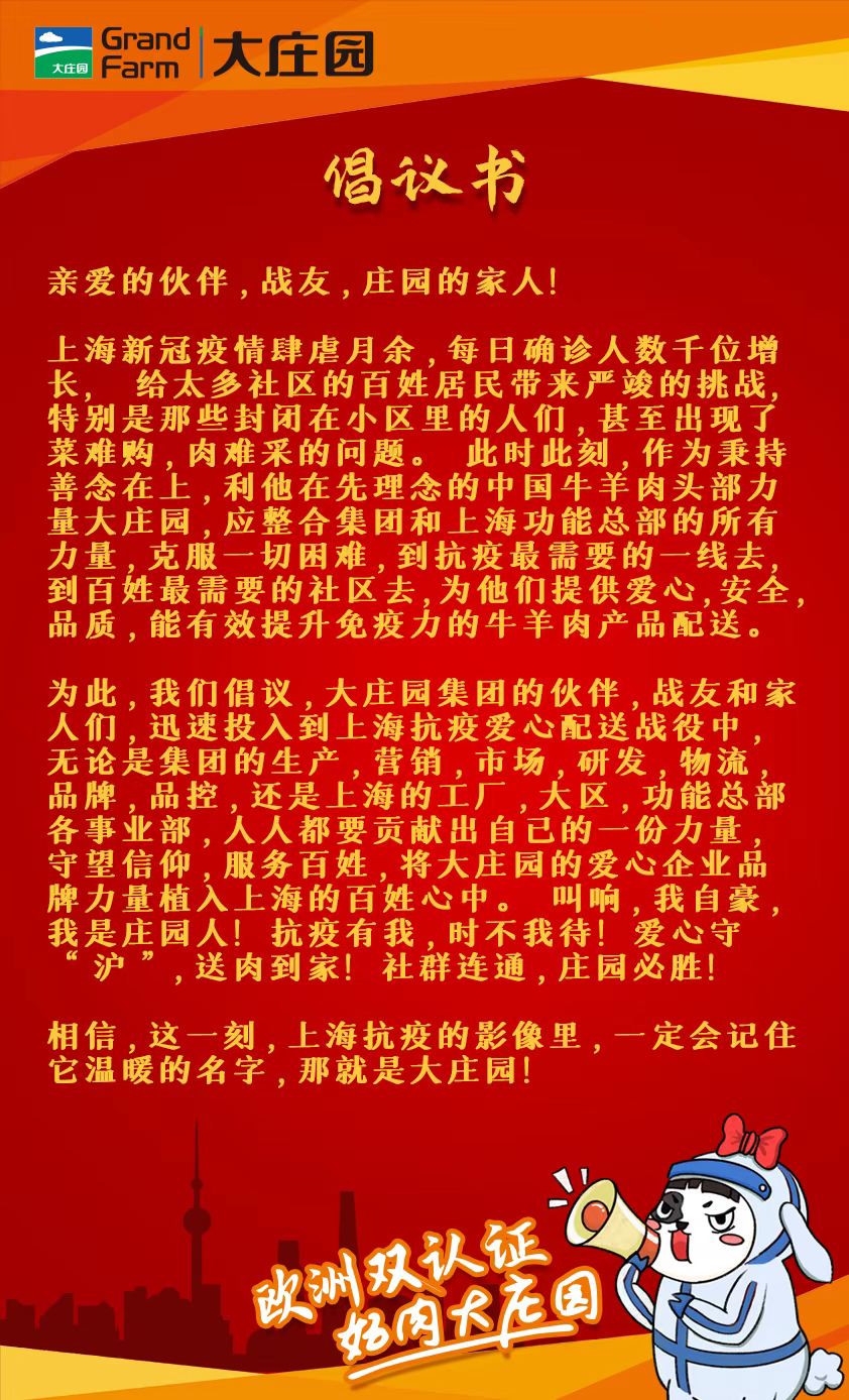 大莊園集團(tuán)火速成立了“大莊園上海抗疫愛心配送項(xiàng)目組”,并向全集團(tuán)發(fā)出了“共同守“滬” 莊園有我”的倡議書。